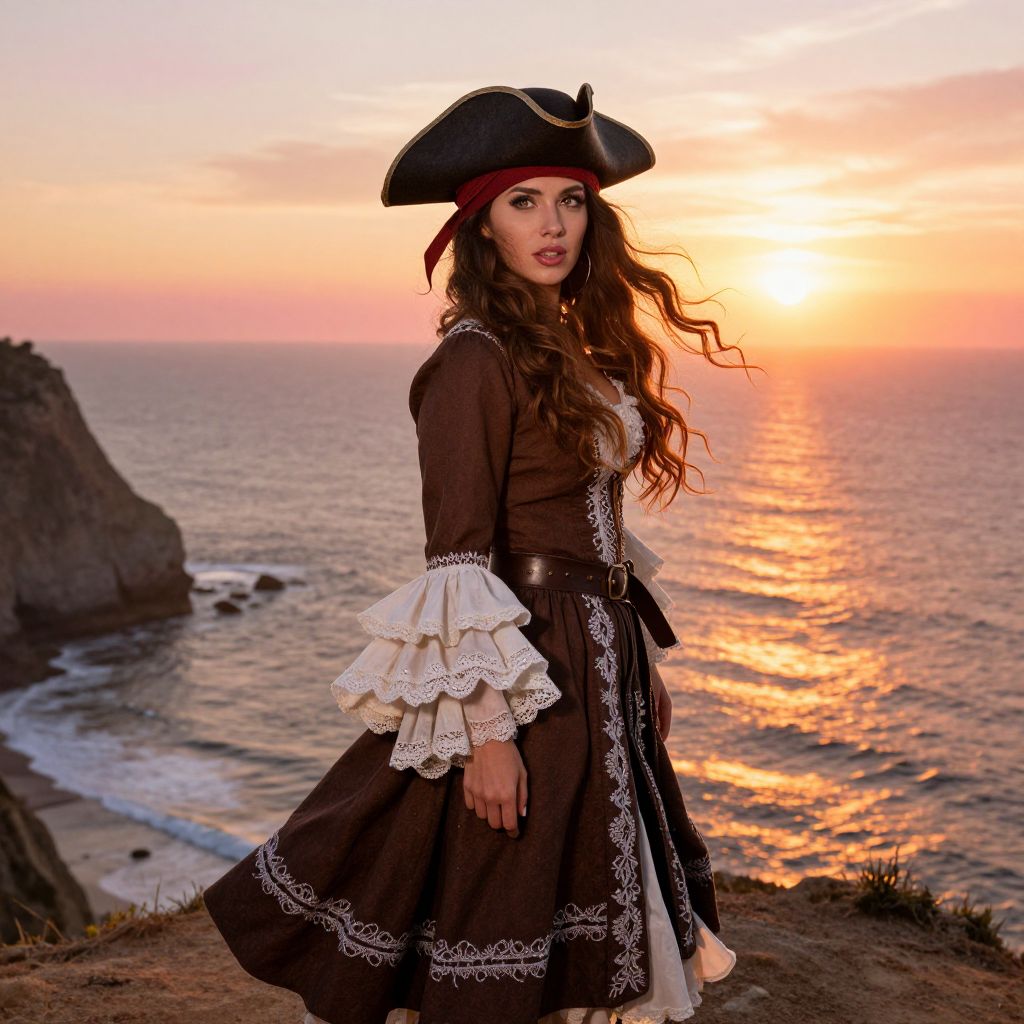 A woman with long, flowing brown hair that cascades down her back like a soft wave, wearing a classic pirate hat with a red band and a brown embroidered dress featuring intricate white lace accents and voluminous ruffled sleeves, stands confidently on a sunlit coastal cliff at sunset. The golden hour bathes the scene in warm light, with the ocean shimmering in the background, its waves gently lapping against the shore and reflecting radiant hues of orange, pink, and gold. Her expression is both confident and playful, her eyes sparkling with a sense of adventure and timeless charm. The wind gently lifts her hair and dress, adding movement and life to the moment, as if she’s stepping out of a fairy tale. The atmosphere exudes warmth, freedom, and a deep connection to nature, capturing the spirit of exploration and romance in a timeless, vivid scene.