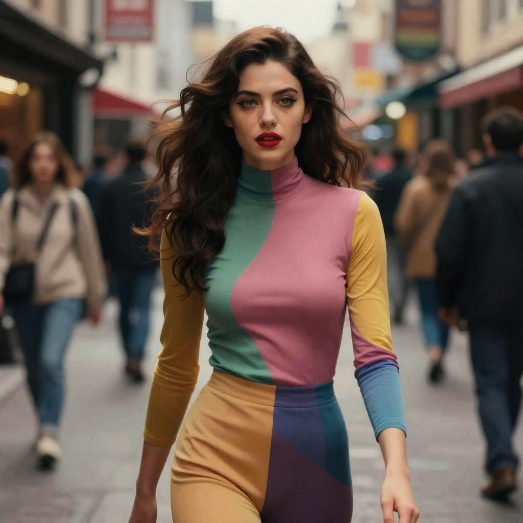 Photo of extremely sexy (s0fv3rgara-140:0.99), a woman as a movie sstar, ((pervpulp15:1.2)), ((windblown hair:1.3)), modelshoot style, (extremely detailed CG unity 8k wallpaper), photo of the most beautiful artwork in the world, professional majestic oil painting by Ed Blinkey, Atey Ghailan, Studio Ghibli, by Jeremy Mann, Greg Manchess, Antonio Moro, trending on ArtStation, trending on CGSociety, Intricate, High Detail, Sharp focus, dramatic, photorealistic painting art by midjourney and greg rutkowski, (colorful tight long sleeve turtleneck dress:1.2), (long trousers), ((crowded shopping street)), (looking at viewer:1.2), (detailed pupils:1.3), (red lips), (eyeliner:1.1), ((closeup portrait:1.1)), (grin512:1.1)