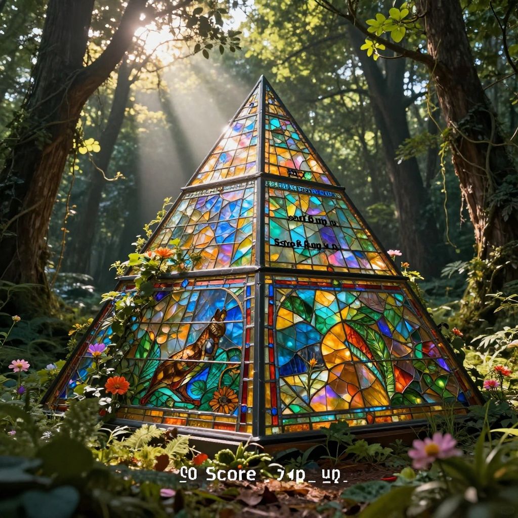 <(score_9, score_8_up, score_7_up, score_6_up, score_5_up, score_4_up):1.0>, <(A realistic pyramid made out of stained glass in a overgrown Forest, sun beaming down on it, Scenery Iridescence, iridescent, hyperrealistic, super lighting sun beam flowers and vines growing up and overgrowing it):1.0>, <(detailed matte painting, deep color, fantastical, intricate detail, splash screen, complementary colors, fantasy concept art, 8k resolution trending on Artstation Unreal Engine 5):0.9>