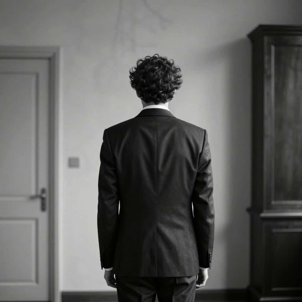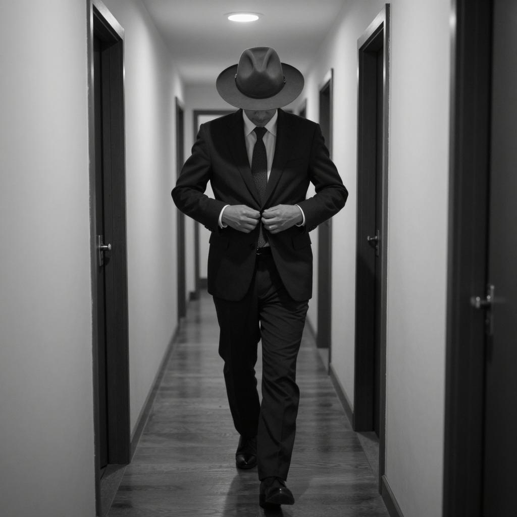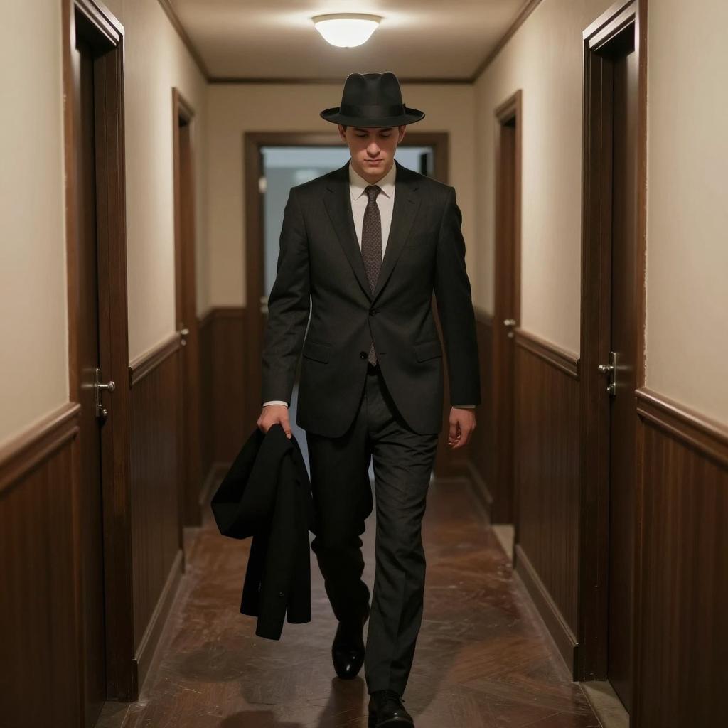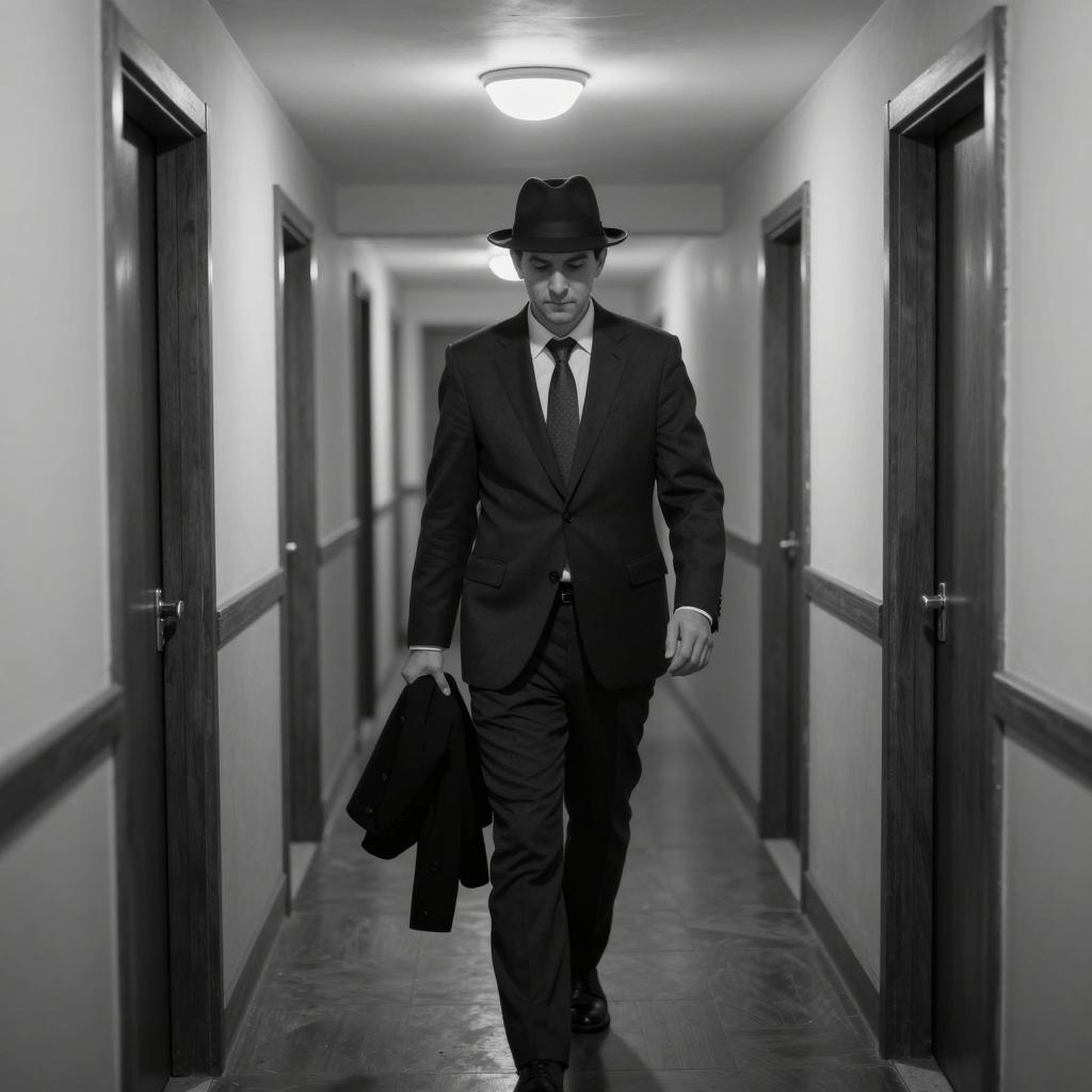 Black-and-white photograph of a man in a dark suit, white shirt, and tie, walking down a dimly lit, narrow hallway. He wears a wide-brimmed hat and holds the edges of his suit jacket. Doors line both sides of the hallway, with overhead lights at regular intervals. The man is centered, walking towards the camera, with his head down and face obscured by shadow. Wooden floorboards underfoot.