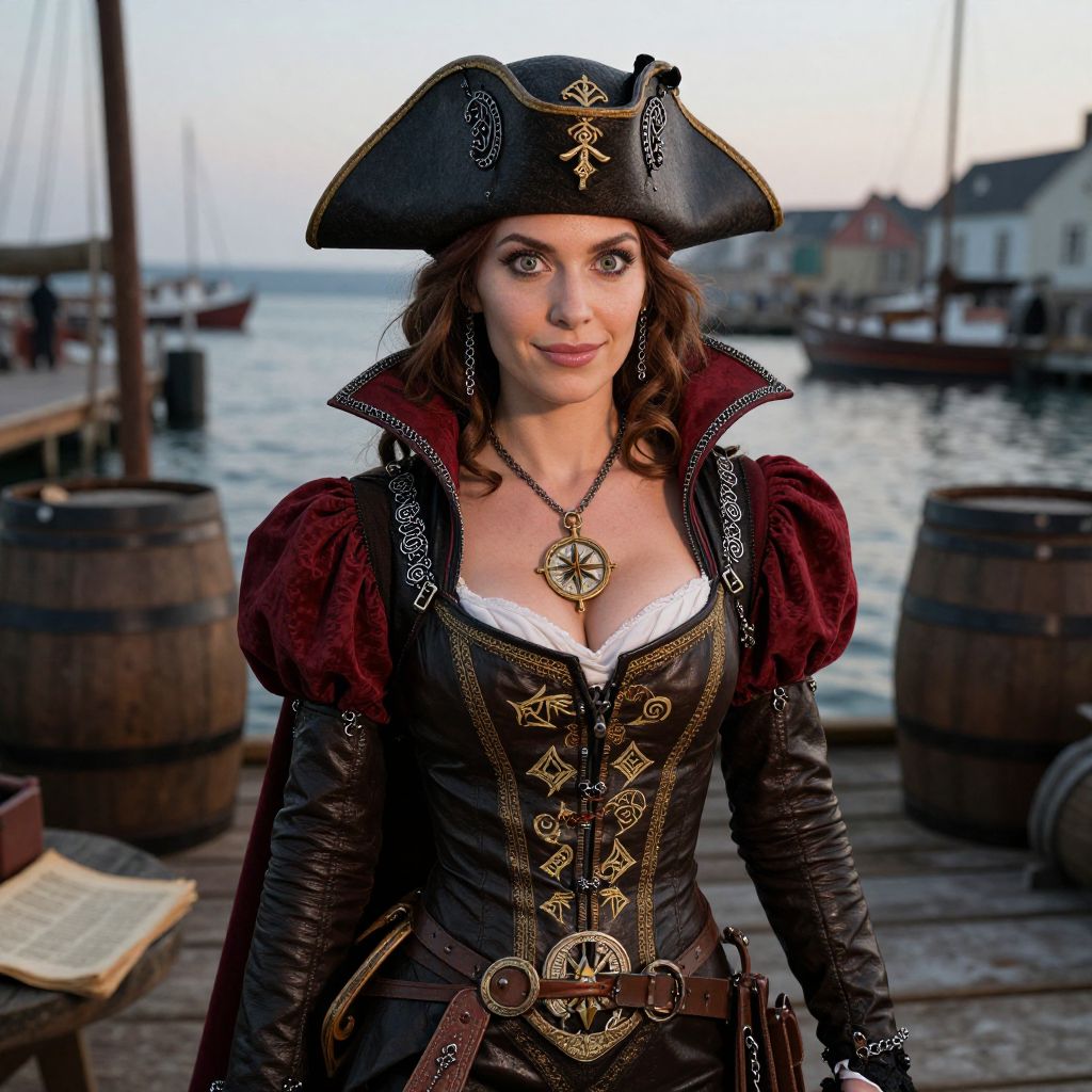 A highly detailed realistic image of a Renaissance woman pirate wearing a custom pirate costume blending alchemical symbols and Renaissance aesthetics—featuring a fitted leather bodysuit with gold embroidery, a high-collared red cape trimmed with silver chains, and a large wooden compass necklace; she has a refined, intelligent face with delicate features, wide green eyes, and a faint smile, standing on a weathered dock in a coastal port at dusk, surrounded by barrels and old manuscripts.. The woman has big breasts and cute face