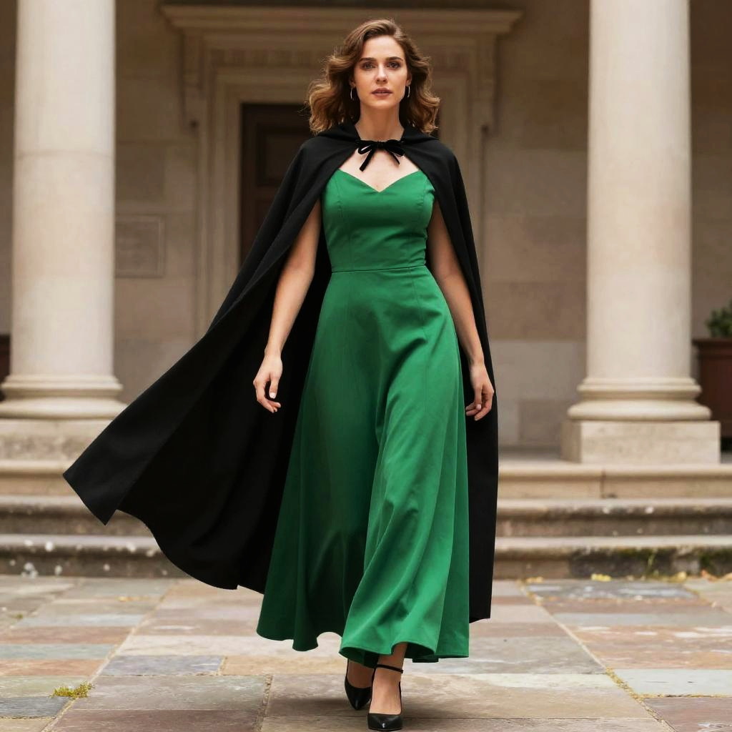 Katherine Pierce Tvd Costume, woman in a green dress and a black cape
