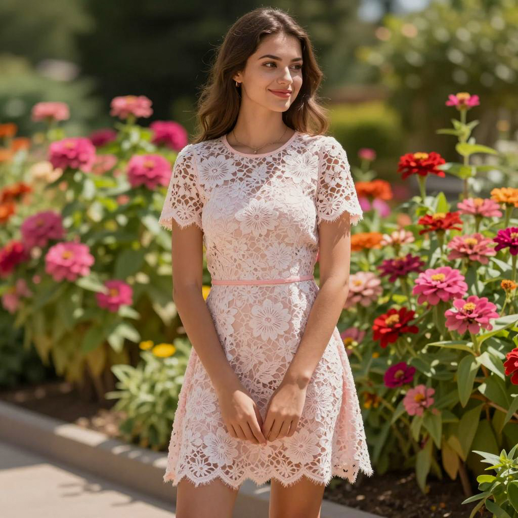 Black glitter dress short, photograph of a beautiful woman with long brown hair, wearing a black lace dress, standing in a vibrant garden, bright red and pink flowers in the background, sunny day, soft shadows, blue eyes, red lipstick, side profile, summer, natural light, realistic, detailed, high quality