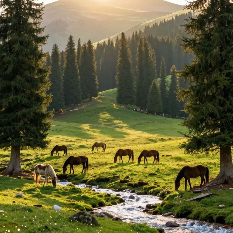 Golden sunlight bathes a serene mountain valley as six horses graze peacefully among lush green meadows, with towering evergreen trees framing the scene and a winding stream flowing gently through the foreground.