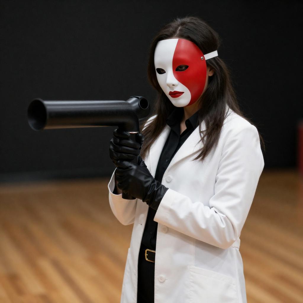 A person in a white coat and black gloves holds a large black pipe-like object. They have long dark hair, a red and white face mask, and intense red lips. Dark background, wooden floor. One person.