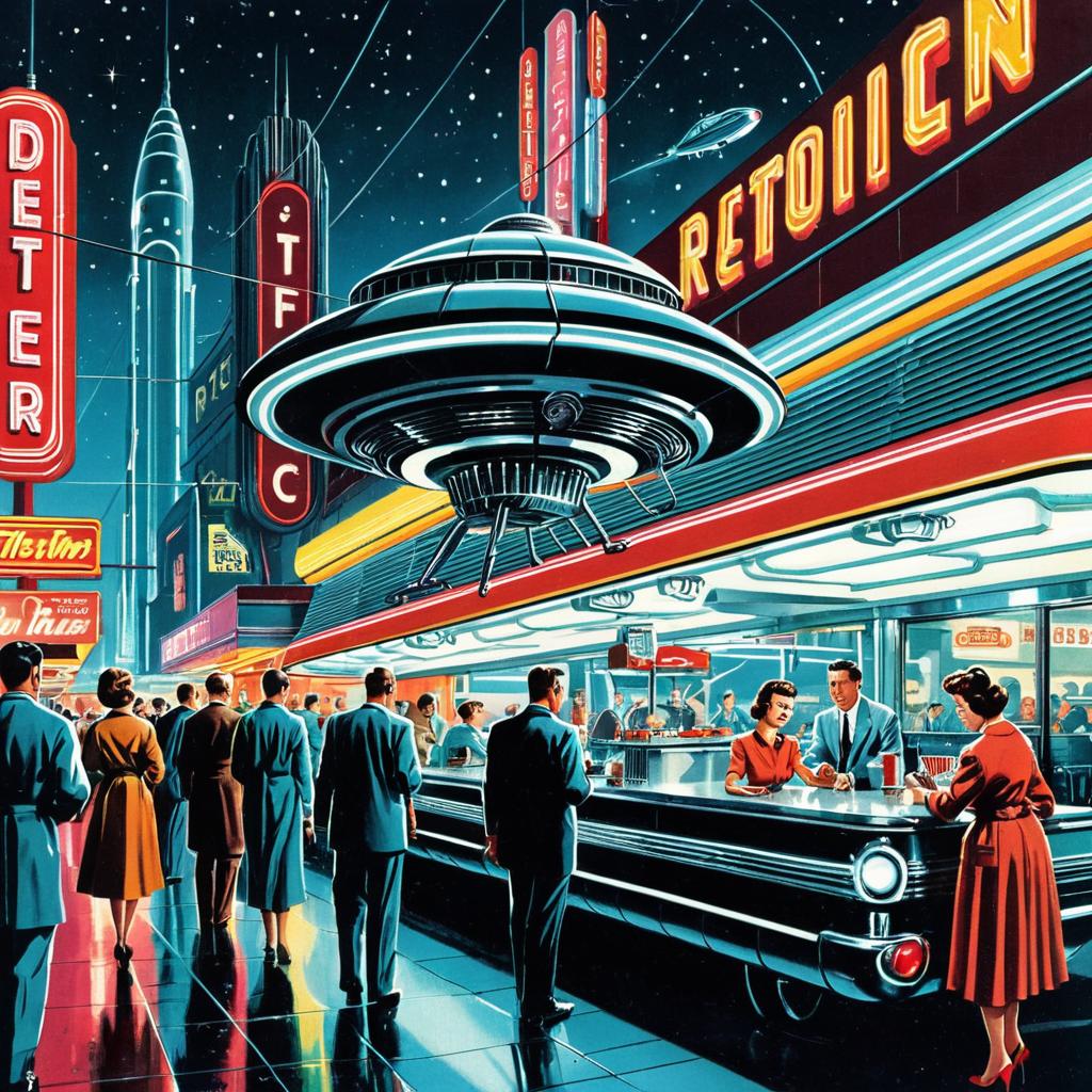 Retrofuturistic 1950s scene depicting a bustling metropolis street with neon-lit signs and hovering robotic vendors serving customers at a chrome retro diner counter. The image features vintage sci-fi art style with electric chrome colors, retro fashion, hi-fi technology, and reflective finishes in classic comic style, evoking a nostalgic yet futuristic atmosphere.