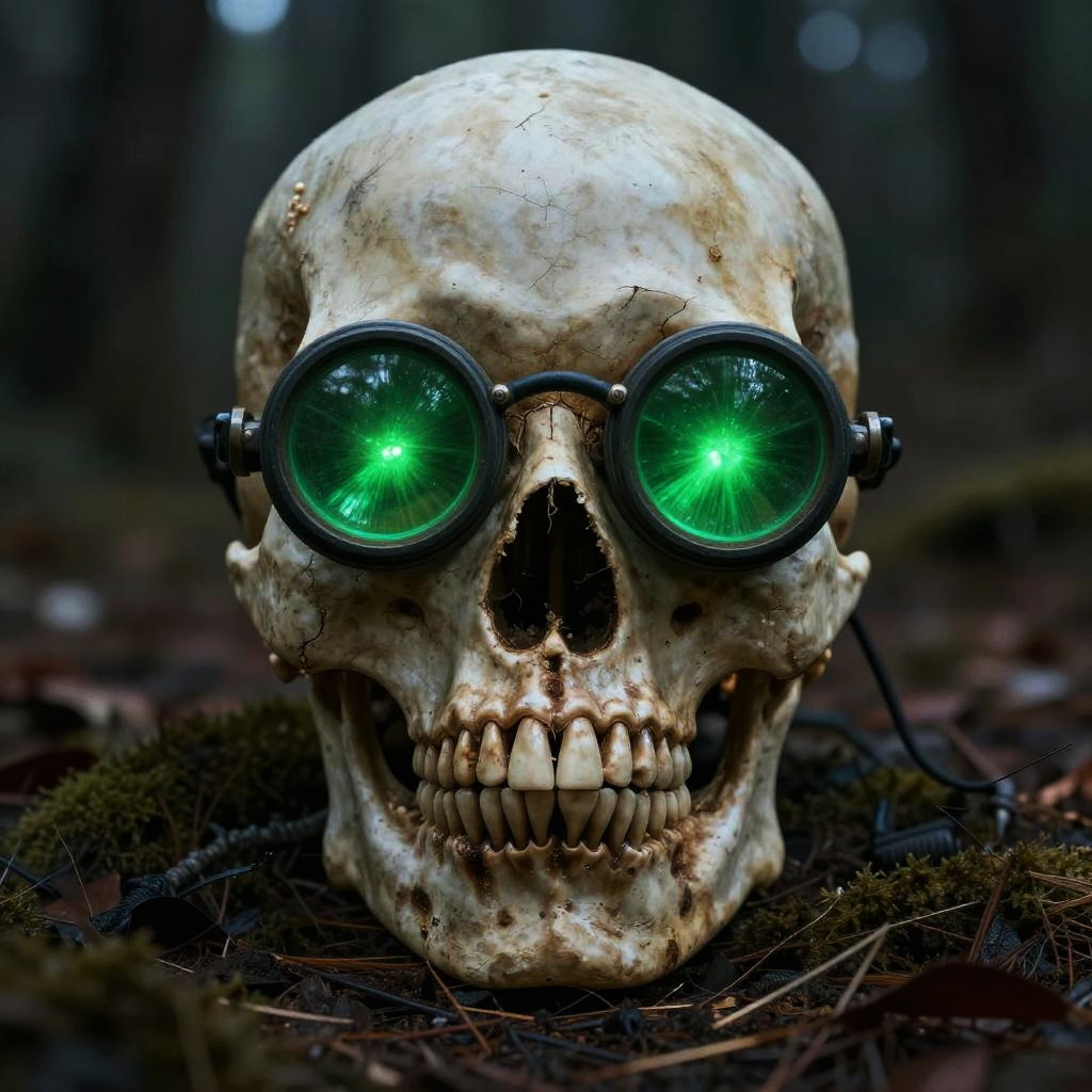 Surreal skull with NVG fused to its head, eerie glowing green lenses, post-apocalyptic setting, cracked bones, dark mystical forest, highly detailed, atmospheric lighting