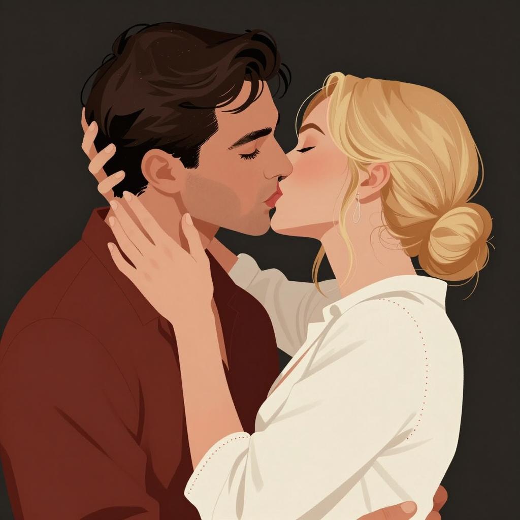 Digital illustration of a man and woman sharing a close, intense kiss. The man has long dark brown hair, a beard, and wears a black patterned shirt. The woman has long black hair and wears a red sleeveless dress with a necklace. His left hand gently holds her face while his right hand rests on her back. Her right hand is placed on his chest. The background features faded sepia-toned portraits of a bearded man in a tuxedo and vintage maps, creating a warm, nostalgic atmosphere.