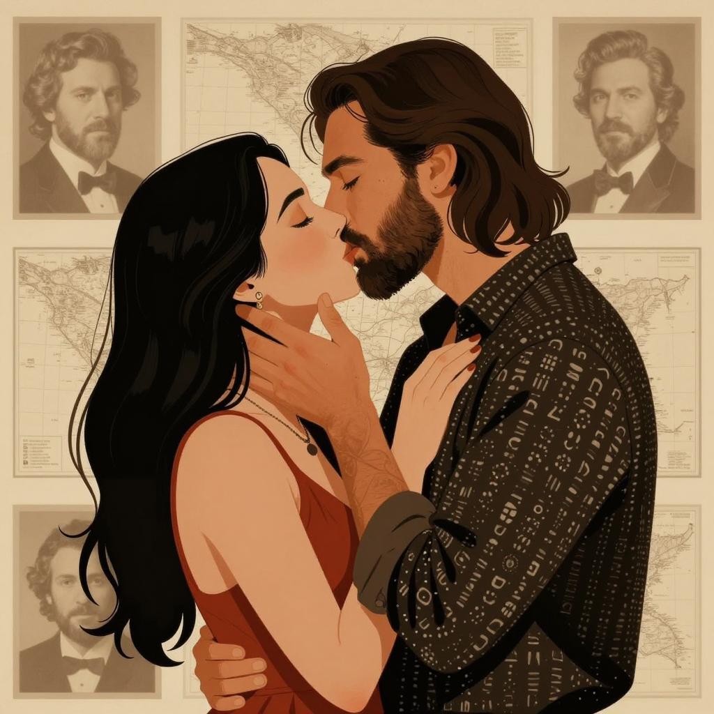 Illustration of a man and woman kissing. Man has long dark hair, beard, black and white patterned shirt. Woman has long black hair, red dress, wearing a necklace. Background has multiple faded portraits and maps. Man's left hand holds woman's face, right hand on her back. Woman's right hand on man's chest. Intense, close-up kiss. Multiple faces in background. Warm, sepia tones.