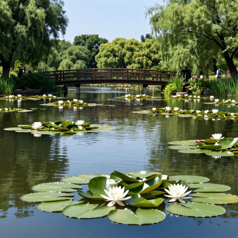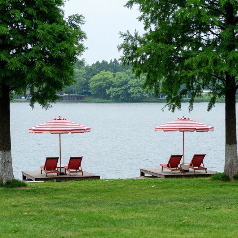 Lush green trees frame a serene lakeside scene featuring two wooden platforms extending over calm waters, each adorned with vibrant red lounge chairs and striped umbrellas, inviting relaxation near a well-maintained grassy area.