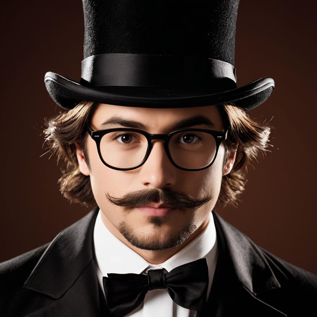 Vintage circus costume man,male focus, 1boy, bow, bowtie, hat, mustache, red bow, suspenders, shirt, red bowtie, white shirt, pants, looking at viewer, long sleeves, vest, black hair, facial hair, standing, arms at sides, closed mouth, blurry, blurry background, solo, black eyes, striped clothes, collared shirt, red headwear