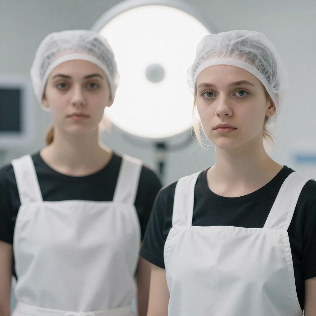 Photograph of two nude women with white tape covering their bodies, standing side by side in a dimly lit room. They have slender physiques and are looking forward. Three men in white lab coats stand between them, observing. Background includes dark, industrial equipment. Top left has a sign reading "Chair Four: Phrenasim New Series."