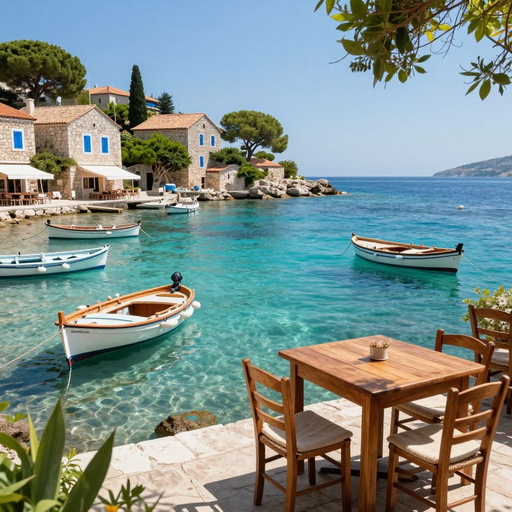 Photograph of a serene coastal village with turquoise waters, stone houses, small boats, wooden table with chairs, and clear blue sky.