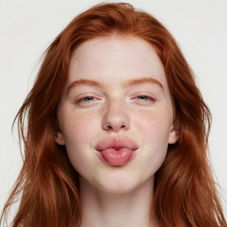 Photograph of a fair-skinned, red-haired woman with freckles, pouting her pink lips, against a white background, showing natural light