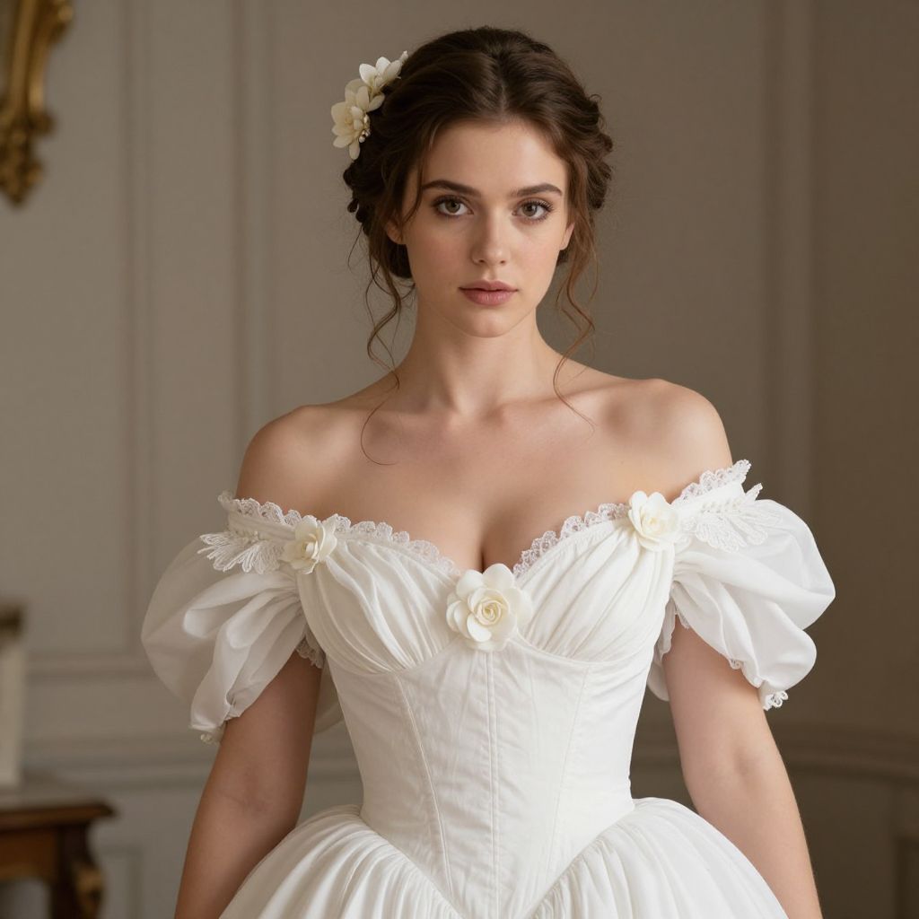 Photograph of a young woman with fair skin and dark brown hair styled in a loose updo, adorned with a white flower. She has striking brown eyes and a focused expression. She wears an off-the-shoulder, white, vintage-style wedding dress with puffed, short sleeves, lace trim, and a central white rose embellishment. The background is an elegant, softly lit room with white paneled walls and a hint of a golden frame on the left. The overall composition highlights her delicate features and the classic, romantic aesthetic of her attire.