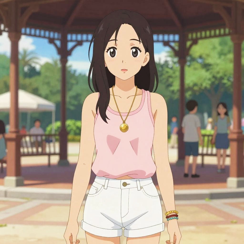 A svelte woman in a casual boho style, wearing a pale pink tank top and white denim shorts, adorned with a gold pendant necklace and layered bracelets, stands under a gazebo in a public square, captured in the vibrant visual style of ufotable. Sexy. Pretty face and beutiful eyes