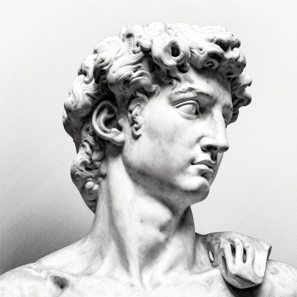 This is a black-and-white, highly detailed, digital drawing of a classical-style sculpture. The figure, a side profile, has wavy hair and a slightly turned head, with a calm expression. The texture mimics the intricate lines of an engraving, with cross-hatching creating depth. The background is a simple, diagonal pattern, adding contrast to the detailed figure.