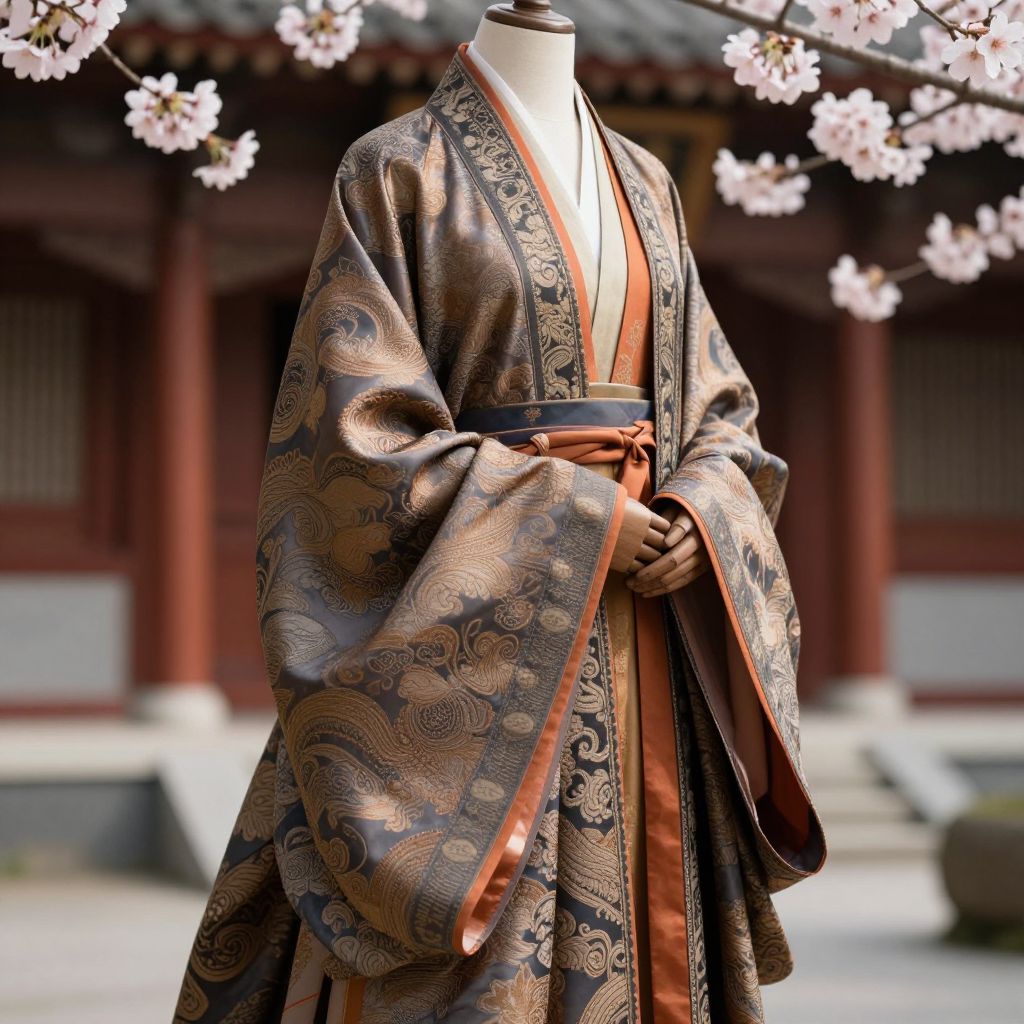 A close-up of a jupan with rich patterns and luxurious silk fabric, draped elegantly on a wooden mannequin in an ancient temple, surrounded by cherry blossoms in full bloom, delicate folds and shadows highlighting the craftsmanship, high-resolution art style.