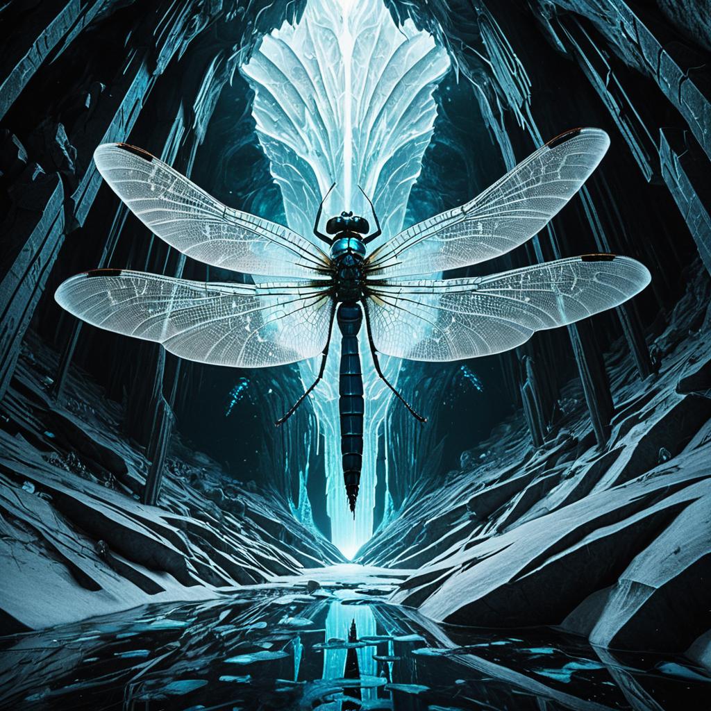 An ethereal dragonfly hovers above a glimmering ice cavern with bioluminescent veins and fractal patterns, blending glitch textures and surreal distortions inspired by James Jean, H.R. Giger, Isabelle Charretier, exploring spiritual symbolism and hidden psychology, cinematic wide-angle perspective with volumetric lighting, hyper-detailed textures, ArtStation quality, 8K ultra-detailed render.