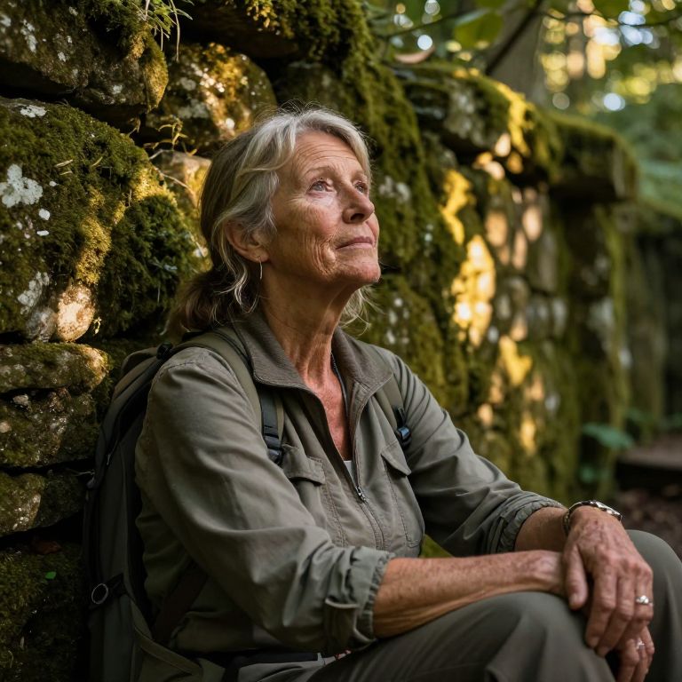 A seasoned explorer in her fifties, with rugged features and weathered skin, exudes an air of introspection as she gazes into the distance from a 'bug's-eye view' perspective. Sitting against an ancient moss-covered stone wall, soft golden light filters through the foliage above, illuminating her lined face and casting intricate shadows behind her. This atmospheric portrait captures both the wisdom and vulnerability in her contemplative spirit, inviting viewers to connect with the mysteries of untouched wilderness.