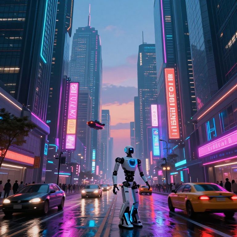 This vibrant, digital art image depicts a futuristic, neon-lit urban scene at night. A central, glowing blue tower rises from a busy plaza filled with colorful, humanoid robot figures in various poses. The plaza is flanked by traditional, East Asian-style buildings with dark, curved roofs. Bright, illuminated signs with bold letters (notably an "A" in pink) adorn the buildings. People, both human and robot, stroll or gather, creating a lively atmosphere. The street is wet, reflecting the neon lights, and is lined with small, warm yellow lights. Tall buildings with numerous windows form the backdrop, adding to the modern, bustling cityscape.