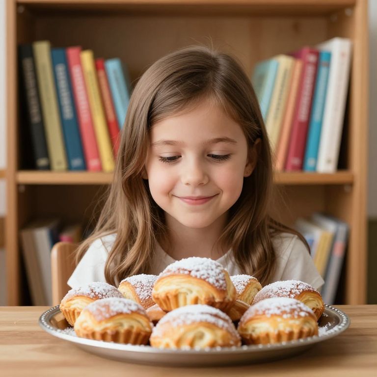 A young girl with long brown hair sits in front of a wooden bookshelf filled with colorful books, her smile directed toward a silver platter laden with freshly baked pastries dusted with sugar, creating a cozy and inviting scene.