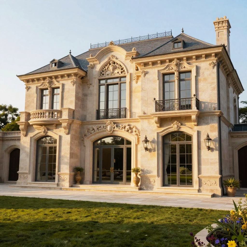 Realistic mansion situated on a sprawling estate, intricate architectural details, large glass windows reflecting lush gardens, ornate stone textures, warm lighting at golden hour, photorealistic style, ultra detailed landscape with subtle shadows