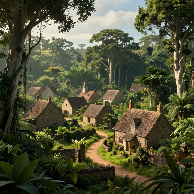 Photorealistic CGI of a serene, lush jungle village with stone cottages, red-tiled roofs, winding path, and dense foliage under a bright