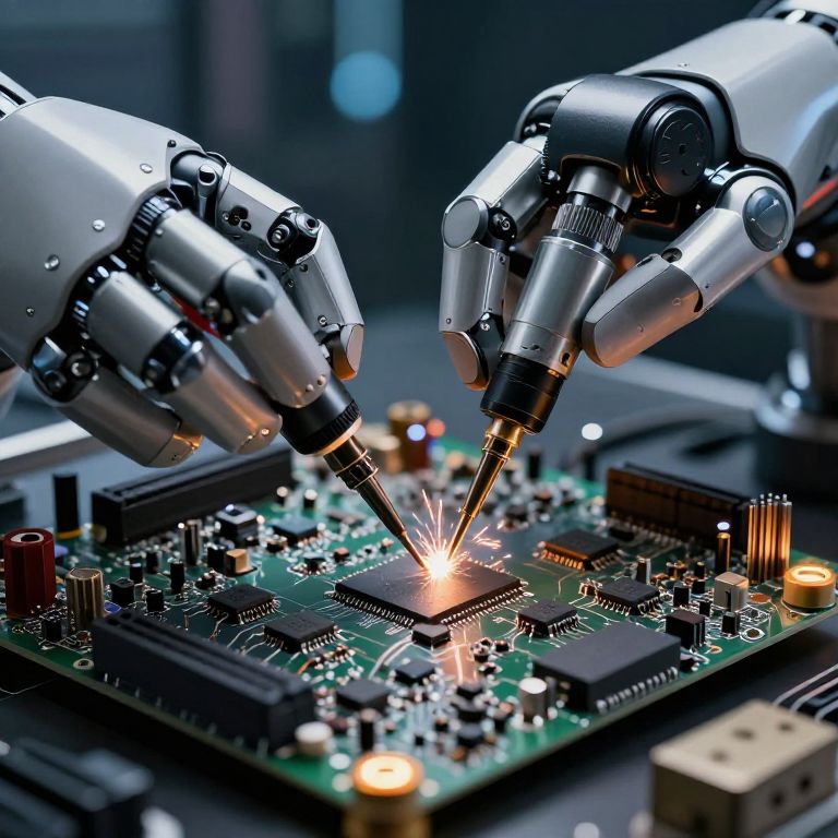 A robotic arm with precision tools performing a delicate surgery in a sterile, futuristic operating room illuminated by soft blue lights.