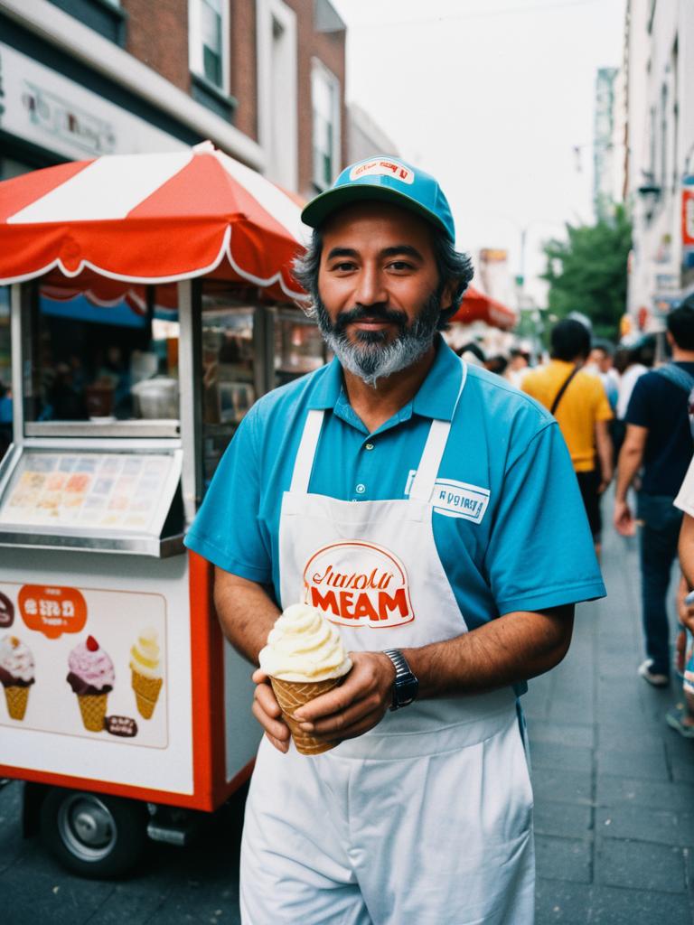 Man in Ice Cream Vendor Costume, candid street cosplay portrait in daylight