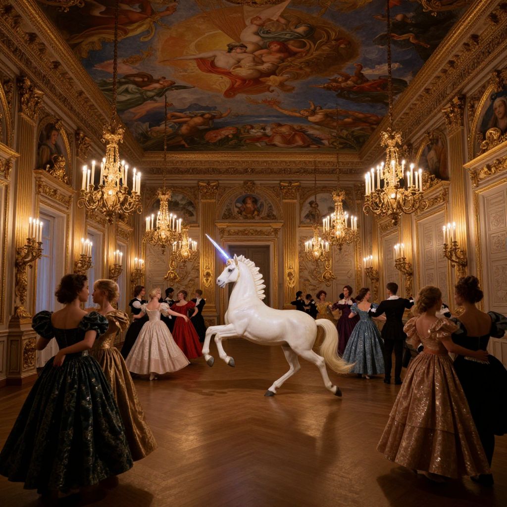 Photograph of a lavish ballroom with ornate, gold-accented walls and ceiling frescoes. A white unicorn with a glowing horn dances amidst