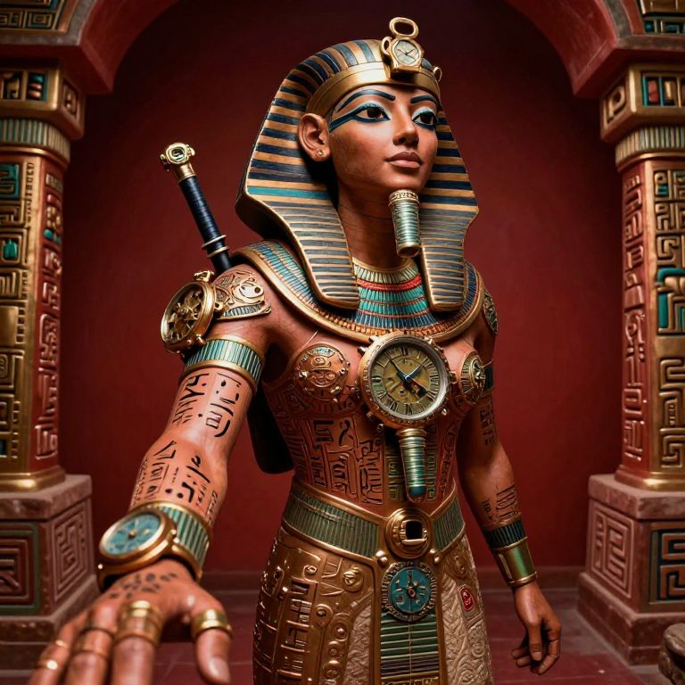 A surreal portrait captures a time-traveling archaeologist in mid-transformation, blending her modern attire with elements from ancient civilizations. The scene unfolds from an 'ant's-eye view', revealing intricate details of her watch mechanism-inspired accessories and futuristic equipment melding seamlessly with Mayan glyphs and Egyptian hieroglyphs etched into her skin. A vivid color palette dominated by bronze and deep reds conveys a sense of urgency, while the surreal juxtaposition of technology and antiquity evokes awe and wonder at the beauty and complexity of both worlds intertwined.