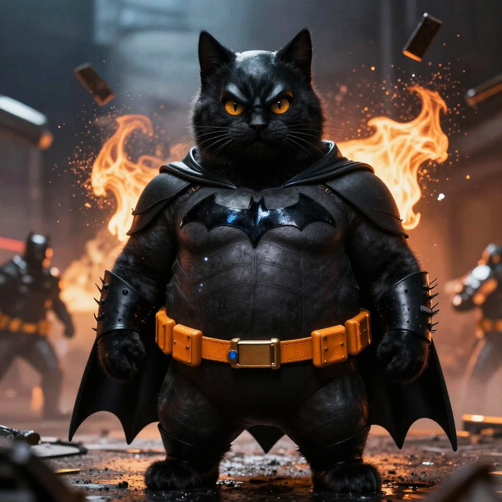 Hyper-realistic image of a fat black furry cat dressed in a detailed Batman costume, featuring a black suit with a bat emblem, orange utility belt, and spiked arm guards. The cat has intense yellow eyes and is set against an action-packed cinematic background with flames and flying bullets.