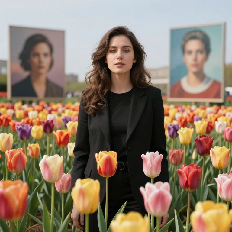 Photograph of a young woman with wavy brown hair, wearing a black long-sleeve blazer over a black top, standing in a vibrant tulip field. The field is filled with yellow, pink, red, and orange tulips. In the blurred background, there are two large, side-by-side portrait posters of the woman, one with a darker background and the other with a lighter background. The sky is clear blue, and the overall setting is bright and colorful, with the tulips in sharp focus in the foreground and the posters in the background slightly out of focus.