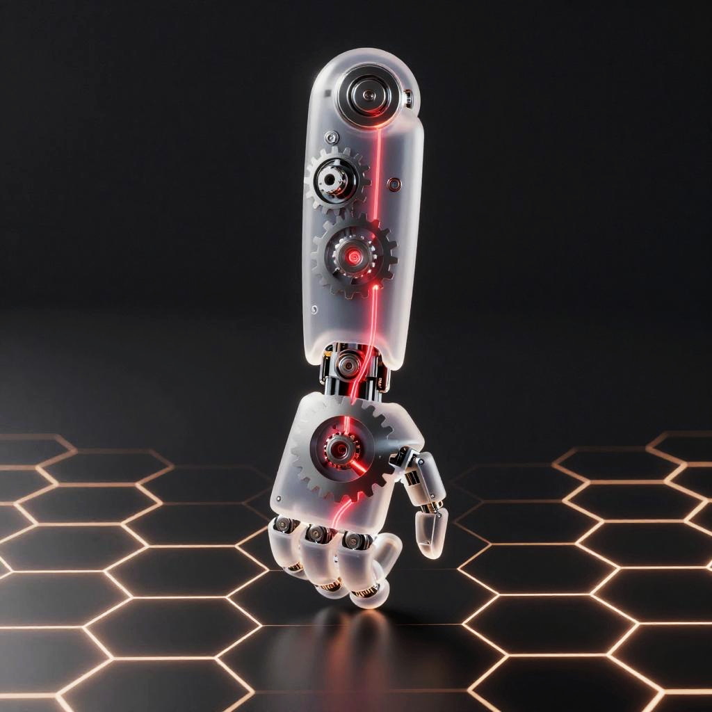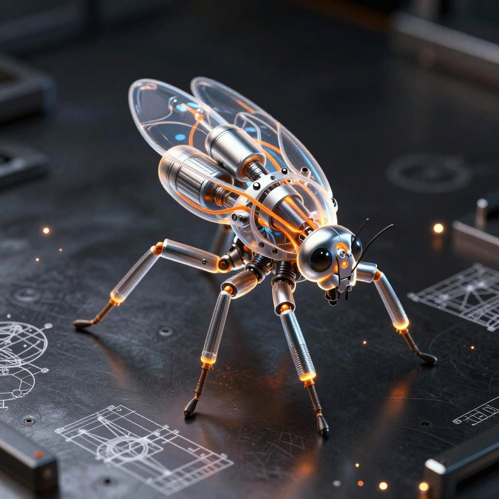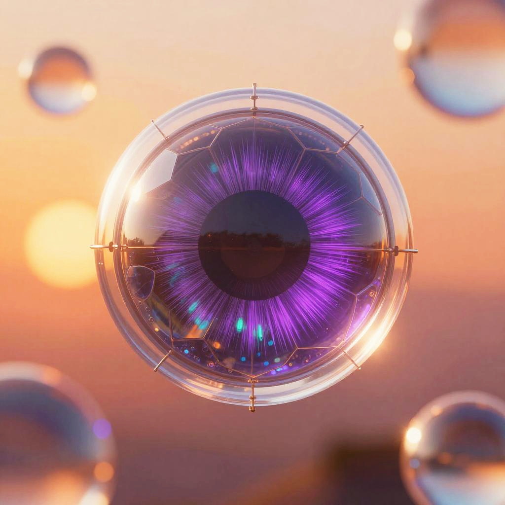 Digital illustration with a modern scientific yet artistic aesthetic, centered on a glowing translucent robotic eye. Interior emphasis on intricate silver sensor arrays with pulsing magenta optic fibers. The scene is set against charcoal black with abstract neon triangle grids and floating light dots. Luminous accents, ultra detailed, crisp edges, high contrast, subtle glow, clean negative space, professional SDXL render.