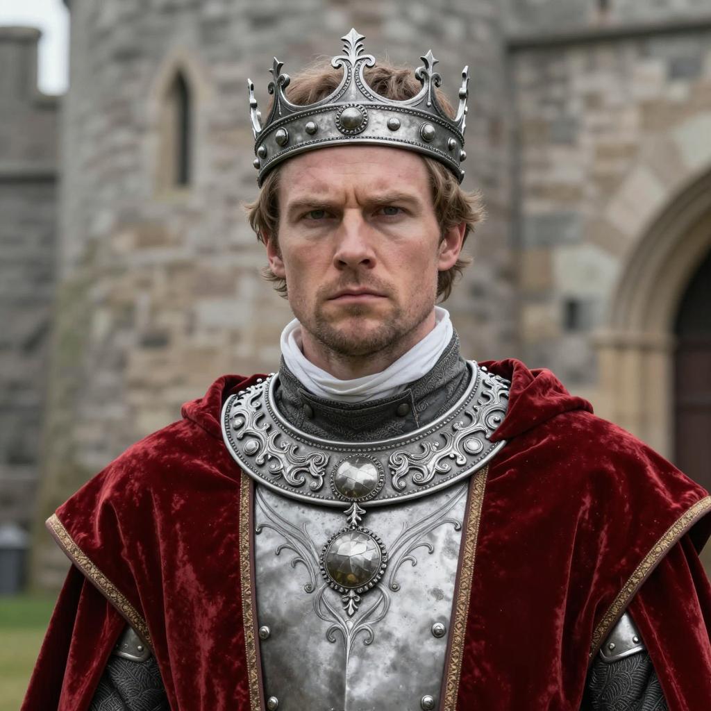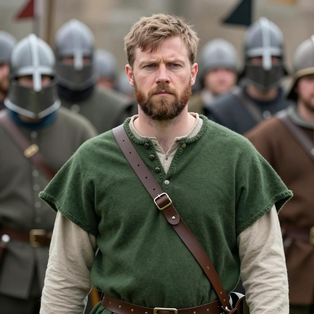 Portrait of a serious light-skinned man with light brown hair and beard wearing a green medieval-style tunic over a beige undershirt, with a brown leather strap across his chest. He stands in front of a blurred background of people wearing gray and brown helmets in a historical or fantasy setting.