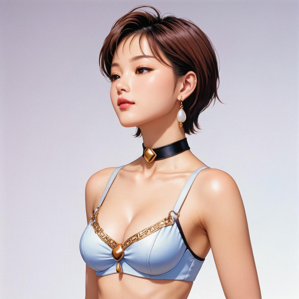 Digital artwork of an Asian woman with short brown hair, wearing a white bra with gold accents, black choker, and white earrings, against a gradient