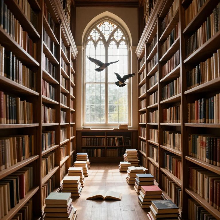Books rest in orderly rows on wooden shelves flanking a grand library aisle, while birds soar gracefully through the air above, casting a serene ambiance as sunlight filters through arched stained-glass windows, illuminating scattered stacks of open and closed volumes on the floor below.