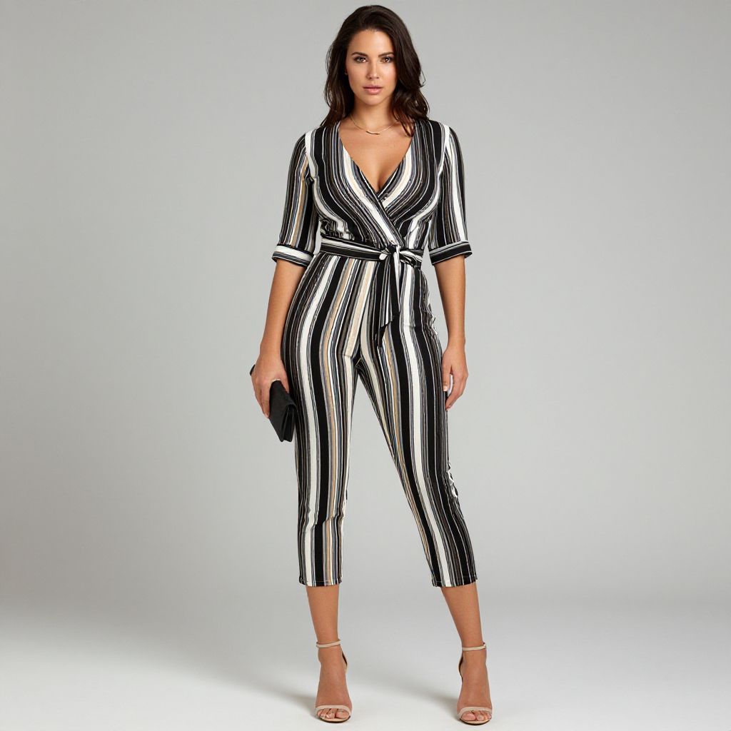 "Woman, modern chic, vertical striped jumpsuit in black, white, and beige, V-neckline, half sleeves, tie-waist detail, cropped length trousers, neutral-toned heeled sandals, black clutch, simplistic gold necklace, photo studio background.. Sexy. Pretty face and beаutiful eyes. Big breasts."