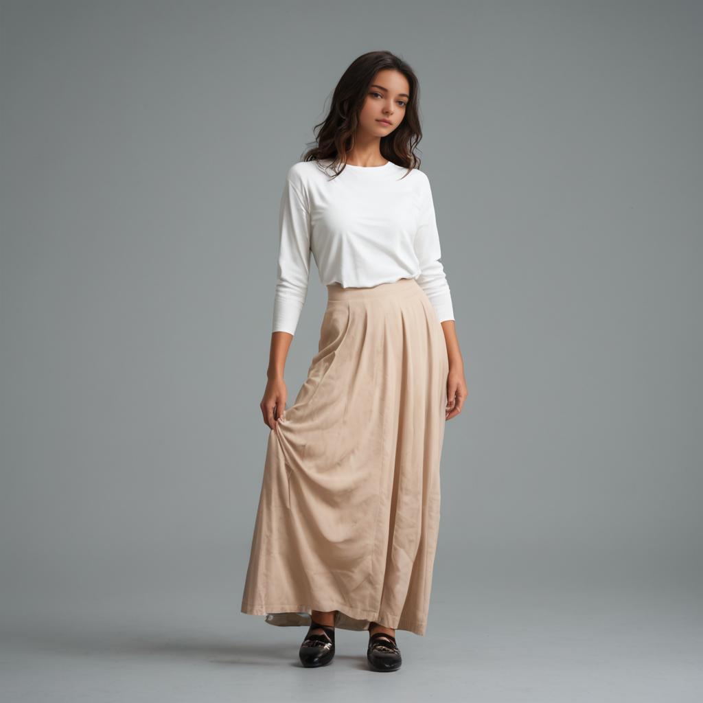 Full body, 1girl, solo, a tall slender figure with matte earthy brown skin, charming almond eyes, and contemporary twisted dark locks pinned up stylishly, long skirt, skirt hold, white shirt, shoes, graceful pose, realistic anatomy, fabric folds, detailed clothing texture, casual elegance, pinned back looks, diplomatically standing, simple background