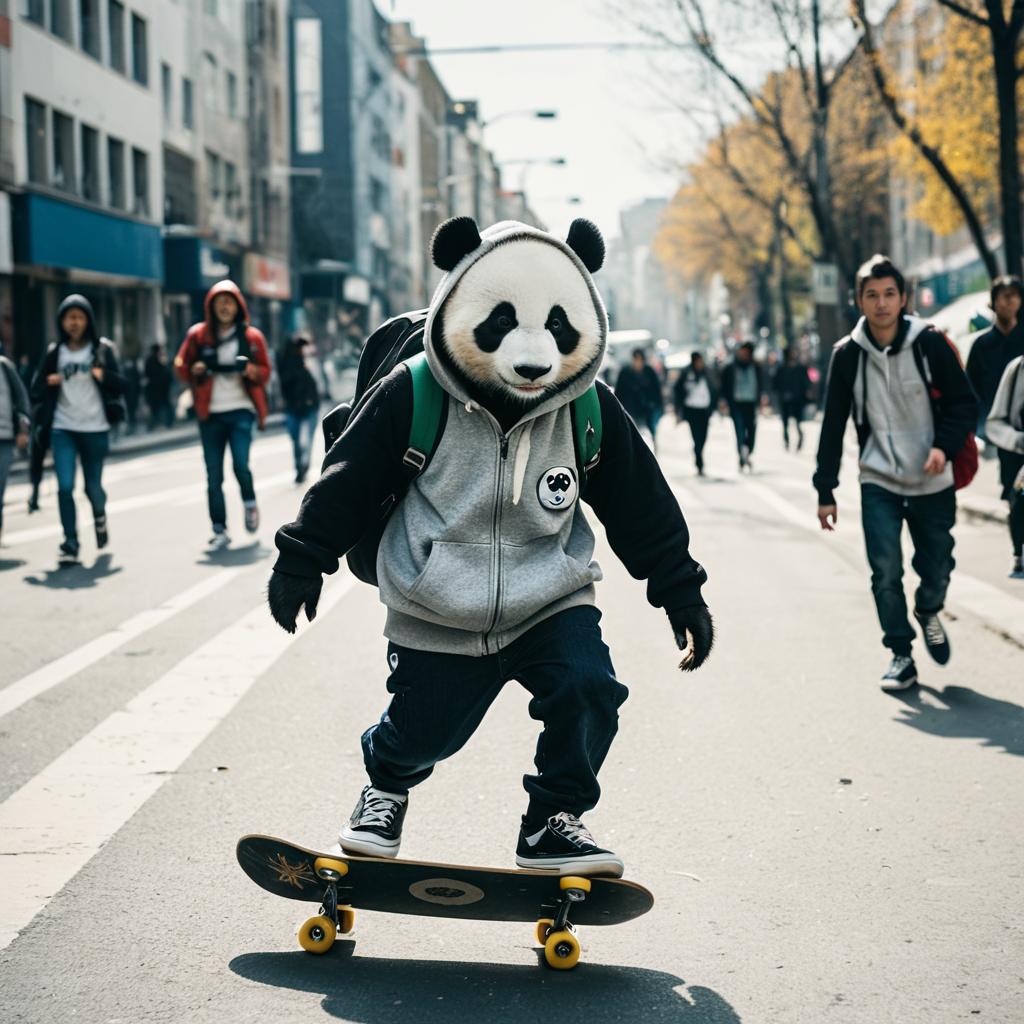 An anthropomorphic young panda dressed in a hoodie with a backpack, skateboarding through a bustling urban street on a sunny day.