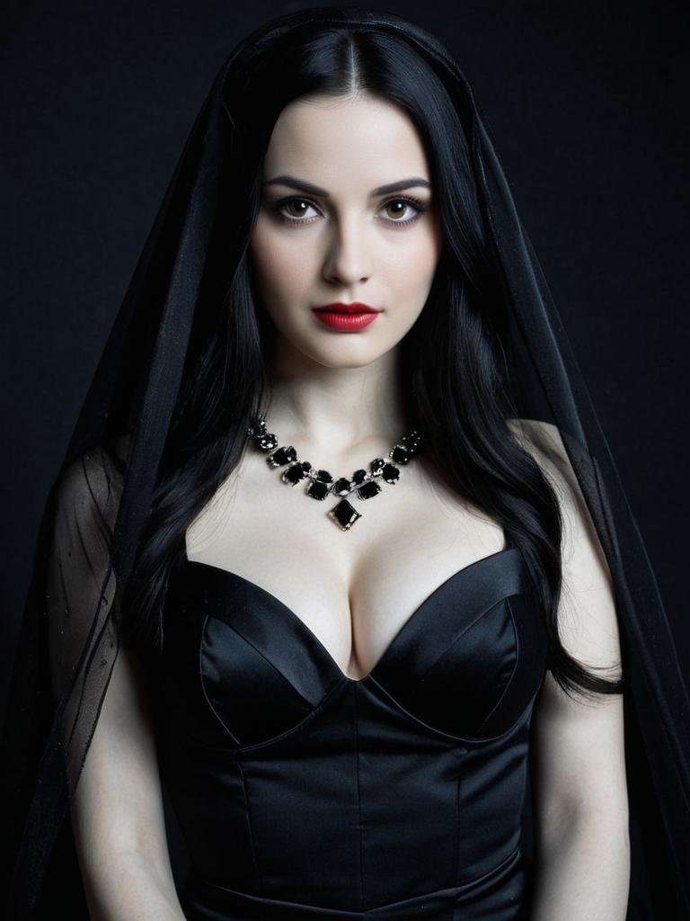 Portrait of a pale-skinned woman with long black hair, wearing a sparkling jeweled veil and a black dress. She has striking red lipstick and black eye makeup, accessorized with a bold black gemstone necklace. The image captures her upper body with a focus on her face and cleavage against a dark background with a hint of red curtain.