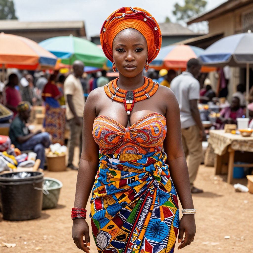 A beautiful African woman in a vibrant traditional African costume, wearing a bright orange and red gele with intricate beading, a handwoven kente cloth wrapped around her waist, and a colorful cotton saree-style dress, standing proudly in a sun-drenched market square in Nairobi, Kenya, with bustling vendors and rich cultural details in the background.. The woman has big tits and cute face
