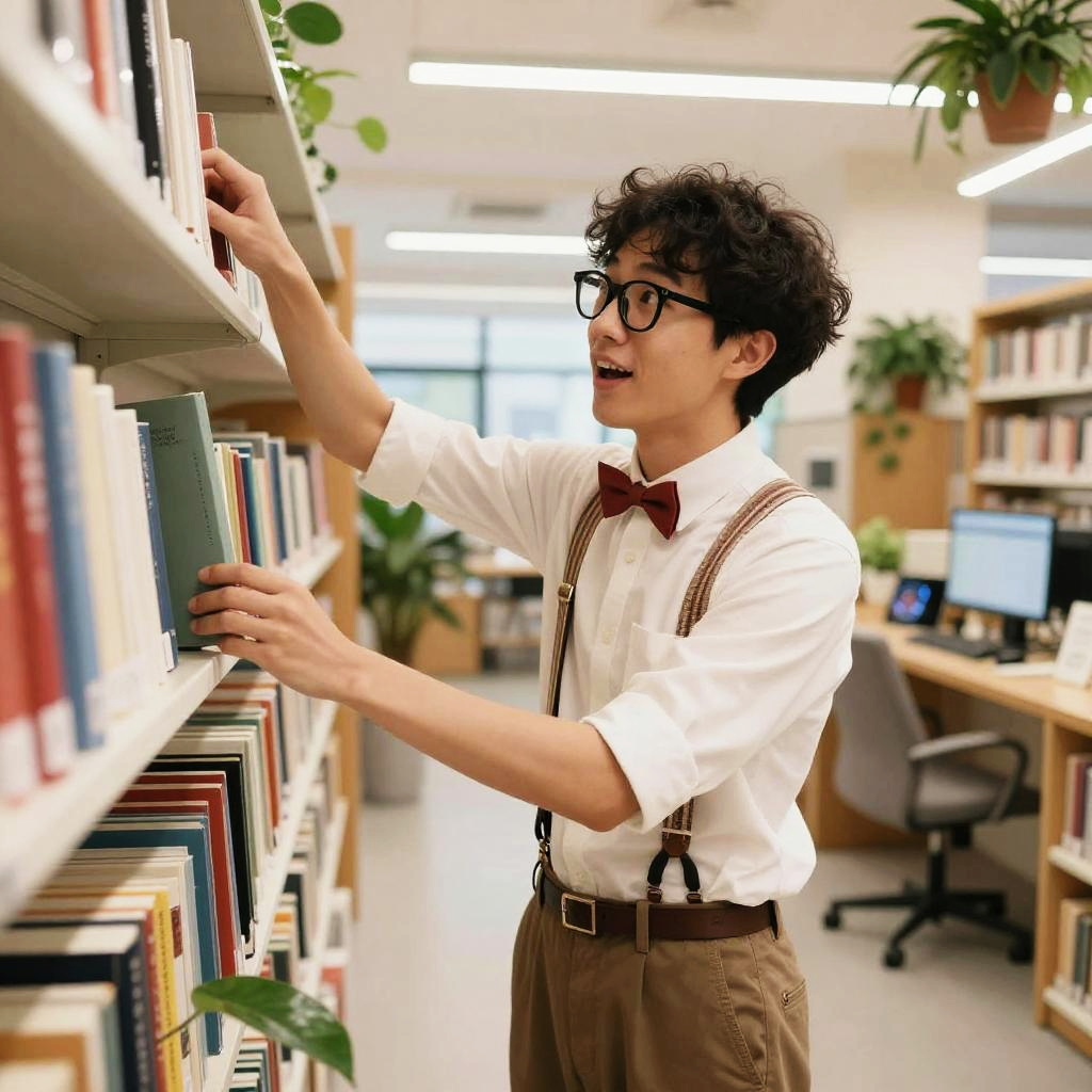 Nerdy librarian organizing books with enthusiasm, wearing a bow tie and suspenders, bright modern library filled with plants and technology, vibrant and lively atmosphere