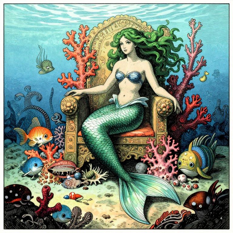 Visualize an intricate pen-and-ink drawing reminiscent of Gustave Doré's detailed illustrations, portraying a mesmerizing underwater scene featuring a regal mermaid with cascading green locks seated gracefully upon a throne of vibrant coral amidst an array of enchanting marine creatures. The composition showcases a distinctive perspective, presenting the scene from below as if viewed from the depths of the ocean floor, revealing the intricate details of her tail and surrounding aquatic life through rich black ink lines and vivid washes of color that evoke both wonder and serenity in equal measure.