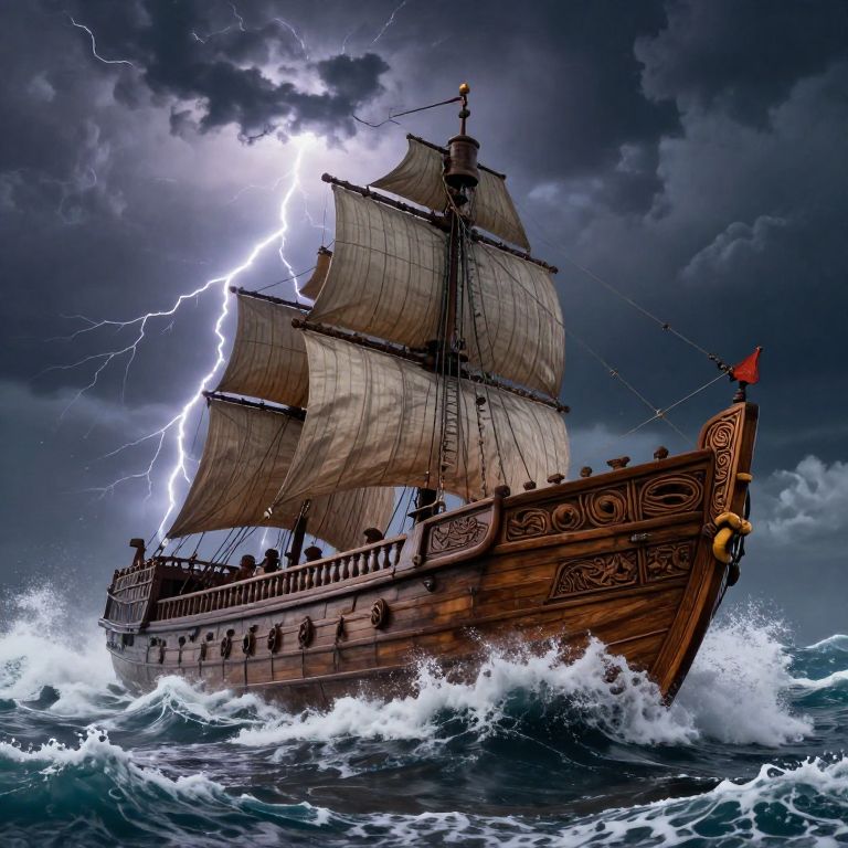 Digital artwork of a wooden ship with intricate carvings, lightning-struck sails, and turbulent waves under a stormy, dark sky.