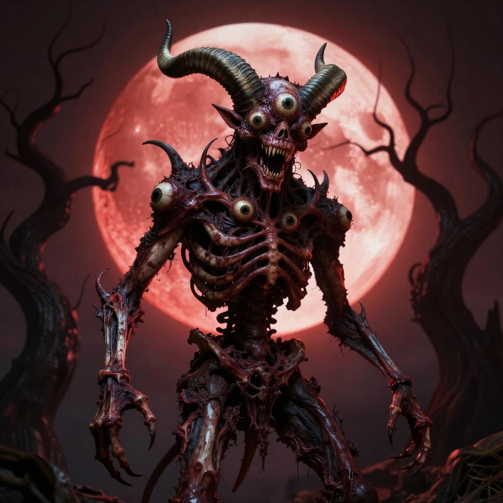 Scary monster body with multiple eyes and elongated horns, skeletal frame covered with decayed flesh, standing under a blood red moon, dark twisted trees in the background