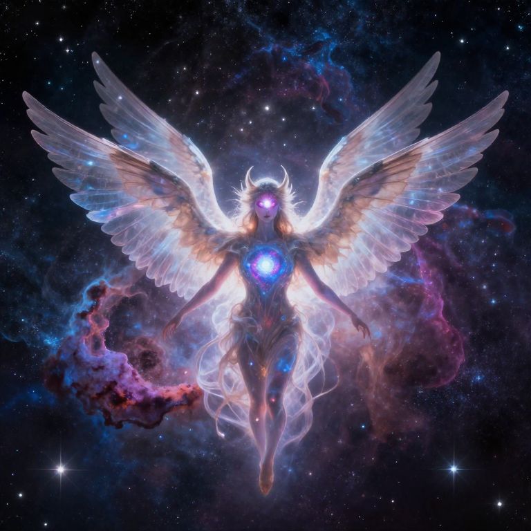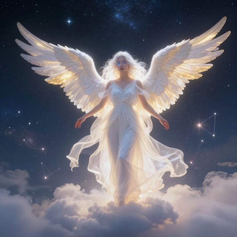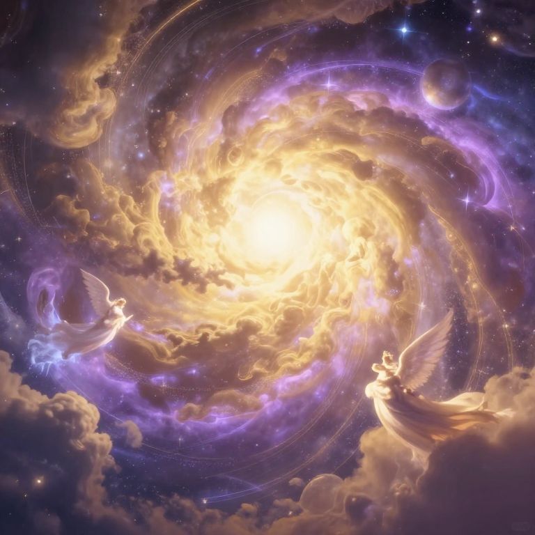 Empyrean skies glowing with ethereal light, celestial clouds swirling in vibrant hues of gold and violet, angelic figures softly illuminated, intricate cosmic patterns woven through the atmosphere, a serene and divine celestial realm, high detail, fantasy art style