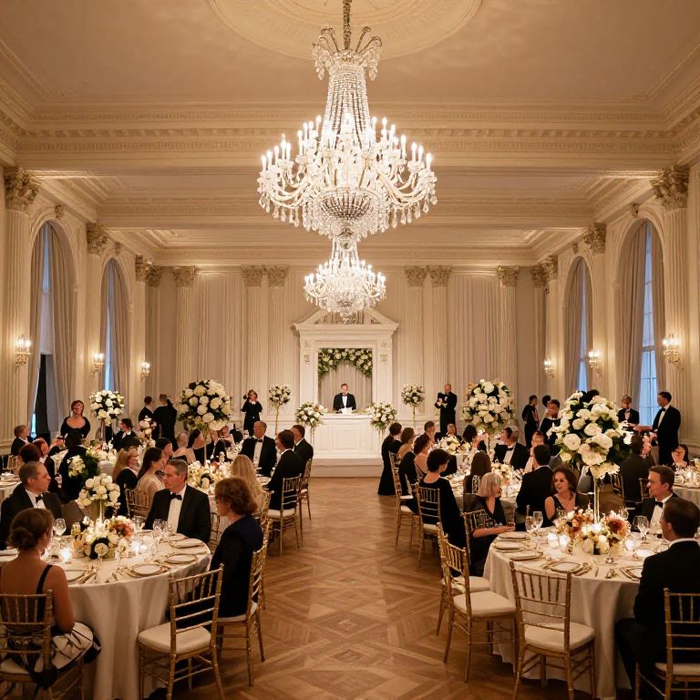 An elegant anniversary dinner under candlelit chandeliers with couples dressed in formal wear, surrounded by floral centerpieces and champagne flutes.