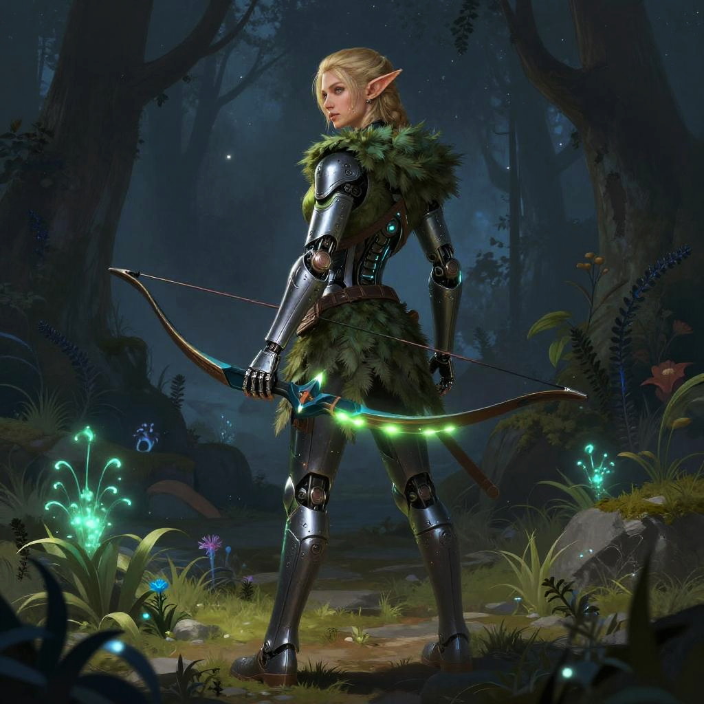 Modern fantasy character art showing a cybernetic elf ranger, sleek metallic limbs combined with natural woodland attire, standing poised with a glowing bow, detailed forest backdrop with bioluminescent plants under a starry night